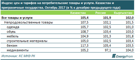 В сегменте непродовольственных товаров РК - также заметный антилидер: рост цен составил 7,5 процента против 2,1 процента в РФ и всего 1,5 процента в КР.