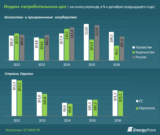 Так, по итогам 2016 года инфляция в России составляла к декабрю 2015 года всего 5,4 процента, против 8,5 процента в Казахстане. Примечательно, что, по официальным данным, в Кыргызстане наблюдалась дефляция (-0,5 процента).