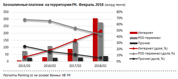 Через интернет-ресурсы в январе-феврале 2018 года проведен наибольший объем безналичных платежей - 306,4 миллиарда тенге, годовой рост сразу в 3,4 раза. Доля от безнала выросла с 34,6 процента до 49,3 процента.