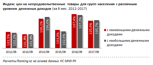 В прошлом году с января к концу сентября цены на потребительские товары для населения с наименьшими денежными доходами увеличились на 6,7 процента, а для граждан с наибольшими доходами рост был менее болезненным - на 5,8 процента. Таким образом, в прошлом году ситуация была диаметрально противоположной, и уровень инфляции для наименее обеспеченных казахстанцев был выше, чем для наиболее обеспеченных.