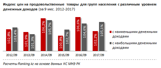 Цены на продукты питания для наиболее обеспеченных казахстанцев в этом году растут гораздо быстрее, чем для малообеспеченных - за девять месяцев прирост составил 4,8 процента и 1,8 процента соответственно, отмечается в исследовании Ranking.kz
