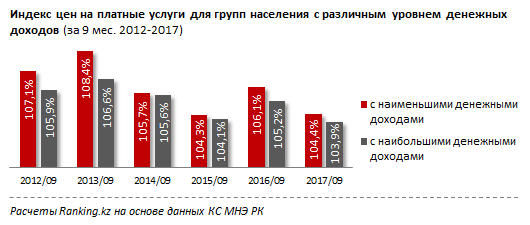 В категории платных услуг без изменений - для малообеспеченных жителей страны цены растут существенно быстрее, чем для наиболее обеспеченных. Хотя в этом году рост цен менее резкий, чем в прошлом, стоимость услуг для населения с наименьшими доходами выросла на 4,4 процента против роста на 6,1 процента годом ранее. Казахстанцы с самими высокими доходами покупают услуги на 3,9 процента дороже, чем в начале года, - против инфляции на 5,2 процента за аналогичный период прошлого года.