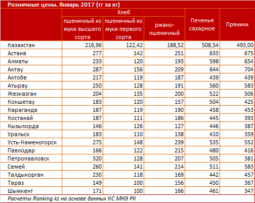 Так, по итогам января 2017 года пшеничный хлеб из муки высшего сорта стоил в среднем 217 тенге за килограмм по республике  (на 8,6 процента больше, чем в январе 2016). Хлеб из ржано-пшеничной смеси обходится казахстанцам в среднем 188,5 тенге за килограмм (на 7,8 процента больше, чем годом ранее). Наиболее недорогой хлеб из пшеничной муки первого сорта поднялся в цене до 122,4 тенге за килограмм.