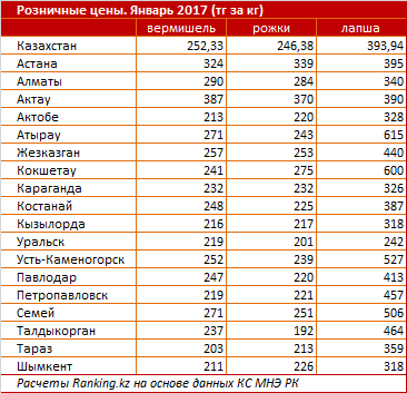 Больше всего за вермишель отдавали жители Актау - 387 тенге за килограмм, +16,2 процента за год, как и за рожки - 370 тенге за килограмм, +19,4 процента. Лапша дороже всего стоила в Атырау - 615 тенге за килограмм, +23 процента за год.