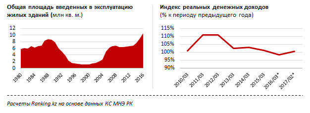 "В текущем же году индекс реальных денежных доходов населения пошел вверх - по сравнению с уровнем годом ранее он вырос на 0,6 процента (январь-февраль), данный факт вкупе с усмирением инфляции дает надежду, что активность на рынке жилья прибавит темпов", - сообщают аналитики Ranking.kz
