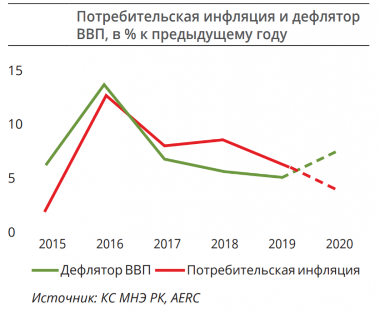 "Учитывая степень ускорения потребительской инфляции и усиления промышленной дефляции, итоговый дефлятор ВВП в 2020 году, по прогнозу AERC, сложится на уровне 4,2 процента против прошлогодних 6,8 процента", - отмечается в обзоре AERC.