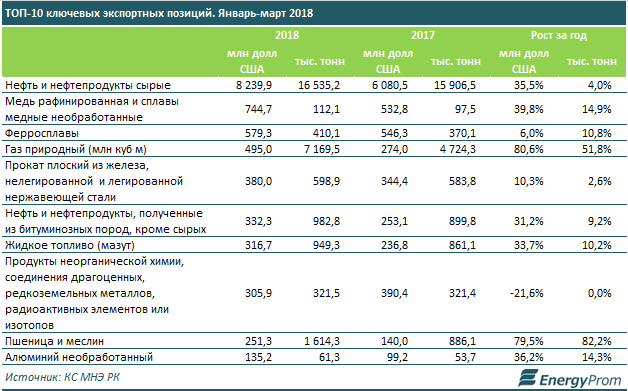 За первый квартал Казахстан экспортировал продукции на 13,8 миллиарда долларов - это на 27 процентов больше, чем годом раннее.