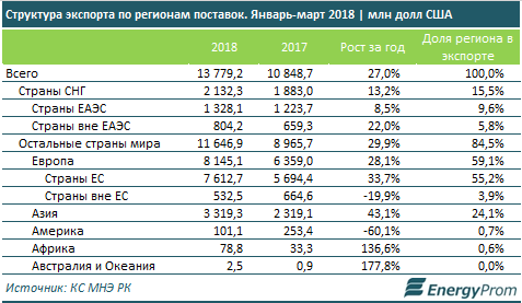 Наибольшие объемы экспорта пришлись на страны Европы - 59,1 процента. Более того, непосредственно на страны ЕС пришлось 55,2 процента всего экспорта РК.