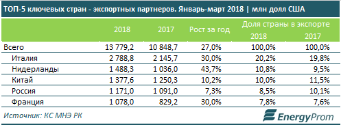 Наибольший рост экспортных объемов в денежном выражении отмечен со странами ЕС: так, поставки в Нидерланды выросли сразу на 43,7 процента за год, до 1,5 миллиарда долларов, в Италию - на 30 процентов год-к-году, до 2,8 миллиарда долларов. Во Францию - также на 30 процентов, до 1,1 миллиарда долларов.