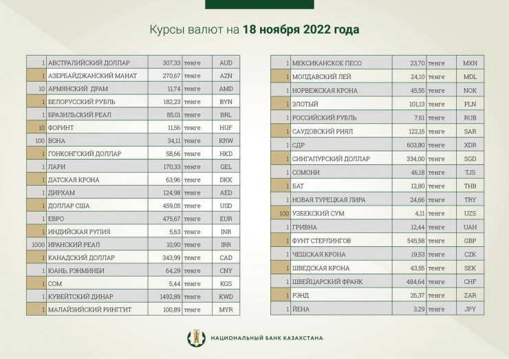 В пятницу официальный курс доллара будет равен 459,05 тенге. Отметим, что официальный курс американской валюты на 17 ноября составляет 459,35 тенге.