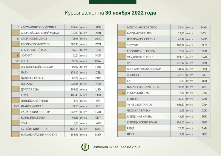 Национальный банк Казахстана установил официальные курсы доллара и рубля к тенге на 30 ноября, передает корреспондент Tengrinews.kz.