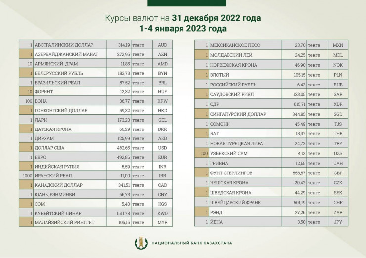 Национальный банк Казахстана установил официальные курсы доллара и рубля к тенге на 31 декабря 2022 года - 4 января 2023 года, передает корреспондент Tengrinews.kz.