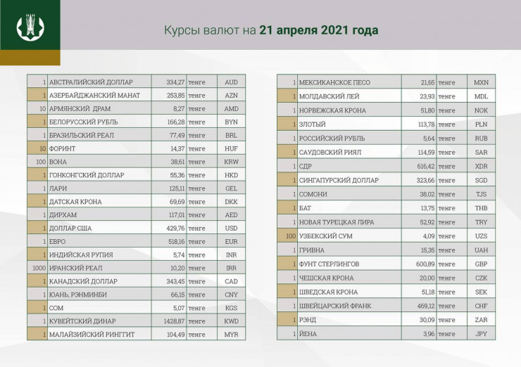 Национальный банк Казахстана установил официальный курс доллара на 21 апреля, передает Tengrinews.kz.