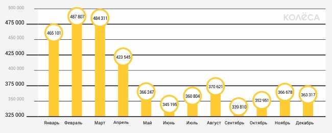 Наибольший провал был зафиксирован в сентябре, когда на продажу было выставлено всего 339 810 автомобилей. Немного больше желающих продать автомобиль нашлось в октябре - на продажу было выставлено 352 951 авто. "Такое снижение по количеству предложений напрямую связано с обвалом национальной валюты, когда в сентябре курс доллара к тенге достиг отметки 270 и продолжал падать", - пояснили эксперты.