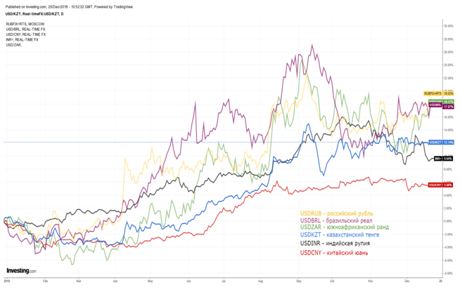 Падали в этом году не только тенге и рубль, но и валюты большинства развивающихся рынков. К примеру, бразильский реал с начала года девальвировал на 18 процентов, индийская рупия - на 10 процентов, китайский юань - на 6 процентов, а южноафриканский ранд - на 18 процентов.