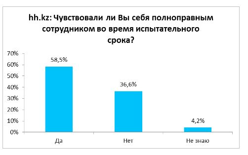 Помимо этого, более половины опрошенных казахстанцев (58,5 процента) отметили, что во время испытательного срока чувствовали себя полноправными сотрудниками и частью команды. Еще 36,6 процента, наоборот, сообщили, что чувствовали себя в компании в этот период неуютно, находились эмоционально на позиции младшего по должности, и многому приходилось учиться.