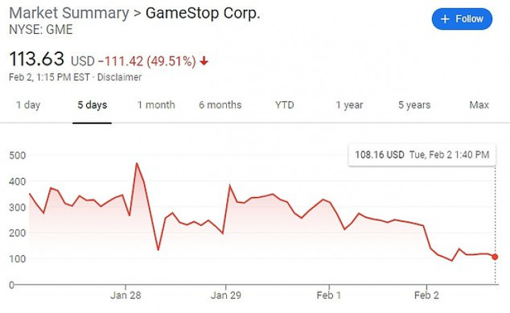 26 января акции GameStop стали самыми торгуемыми в мире, обойдя ценные бумаги Tesla, Apple и Microsoft, а с открытием сессии 27 января цена подскочила еще на 152,74 процента - до 374 долларов за одну ценную бумагу.