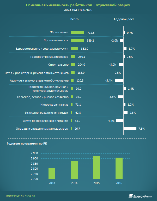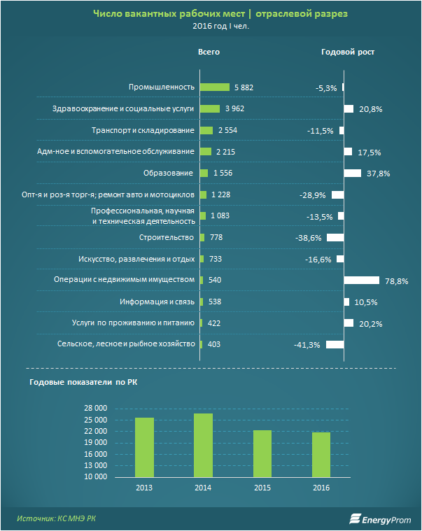 В Казахстане потребность в новых сотрудниках на крупных и средних предприятиях сократилась на 36 процентов в 2016 году, а число вакантных мест уменьшилось на два процента, к такому выводу пришли специалисты аналитической службы Energyprom.kz. По информации аналитиков, снижение обусловлено двукратным уменьшением ожидаемой потребности в сотрудниках в секторах промышленности и здравоохранения, и почти четырехкратным - в сфере административной деятельности.