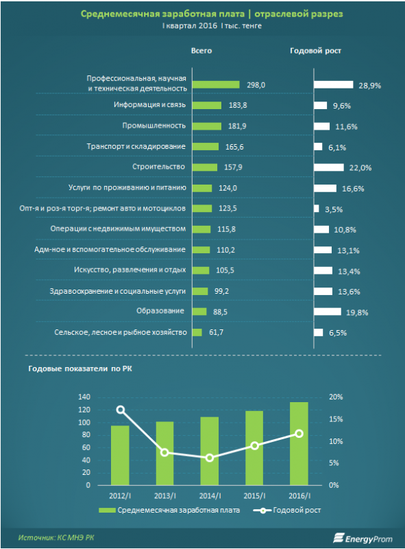 Также аналитики привели данные, в каких сферах деятельности отмечены самые высокие и низкие зарплаты. "Самые высокие среднемесячные заработные платы по итогам первого квартала 2016 года отмечены в сфере профессиональной, научной и технической деятельности (298 тысяч тенге, плюс 28,9 процента, самый высокий темп годового роста), в области информации и связи (193,8 тысячи тенге, плюс 9,6 процента), и в промышленности (181,9 тысячи тенге, плюс 11,6 процента)", - рассказали в аналитической службе.