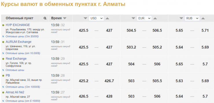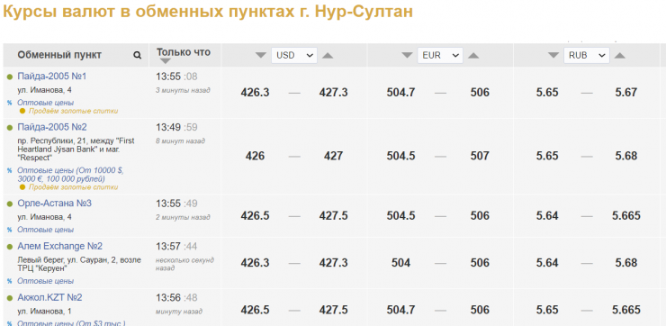 Сейчас, по данным kurs.kz, обменные пункты Нур-Султана продают доллар по 427-427,5 тенге, покупают по 426-426,5 тенге. В Алматы продажа доллара сложилась на уровне 426,7-428 тенге, покупка - 425,5-426,5 тенге.