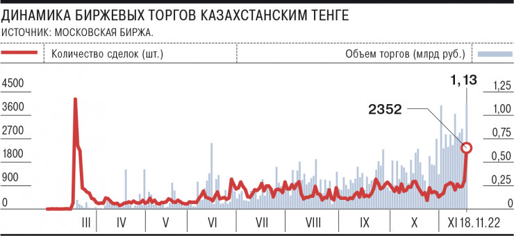 Объемы торгов с казахстанским тенге на Московской бирже 18 ноября составили 1,13 миллиарда рублей, это максимум за все время обращения валюты. В сумме за минувшую неделю инвесторы наторговали казахстанской валютой на 4,2 миллиарда рублей, что на 7 процентов выше показателя прошлой недели и в 3-4 раза выше значений летних месяцев.