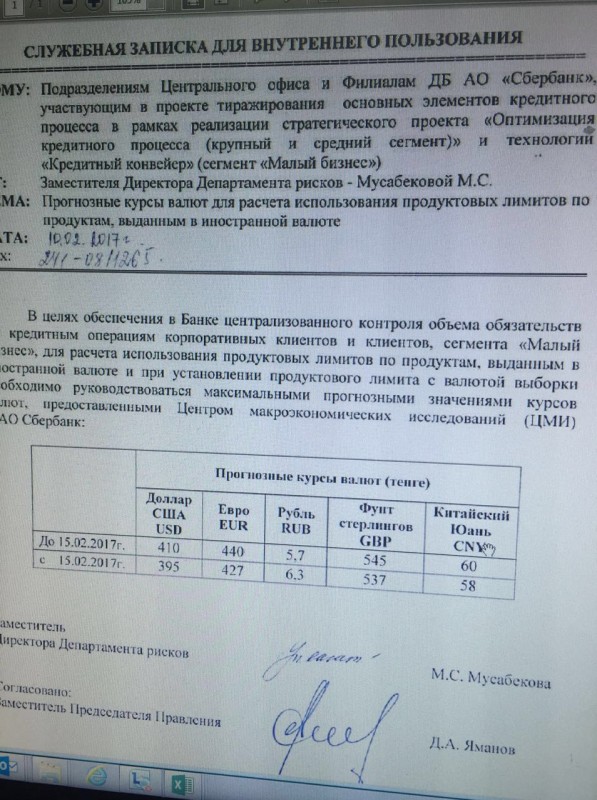 В связи с распространением в мобильных мессенджерах фото внутреннего документа ДБ АО "Сбербанк" поясняем: "На фото, которое распространяется через мобильные мессенджеры, изображен внутренний нормативный документ банка, который не имеет никакого отношения к операциям по купле-продаже валюты. Данный документ содержит прогнозные показатели курса иностранных валют с целью обеспечения контроля объема обязательств по кредитным операциям корпоративных клиентов, о чем говорится в тексте документа. В связи с действующим режимом свободно плавающего курса тенге в банке ежедневно просчитывается множество вариантов развития событий, в том числе риск-модели, в которых содержатся прогнозные показатели, исходя из колебаний и изменений курса валют", - сообщила пресс-служба банка в ответе на запрос редакции.