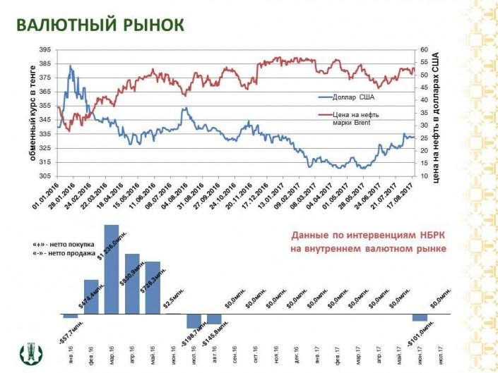 На очередной встрече с экспертами финансового рынка заместитель директора Департамента монетарных операций Национального Банка Адиль Мухамеджанов отметил, что к настоящему моменту ситуация стабилизировалась. По состоянию на 22 августа 2017 года обменный курс сложился на уровне 333,08 тенге за доллар США.