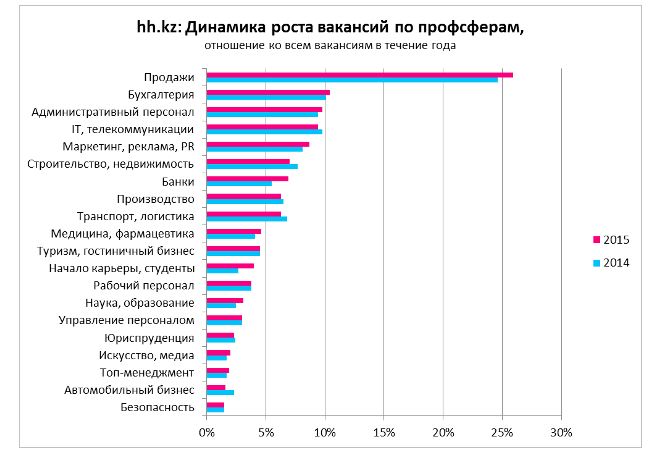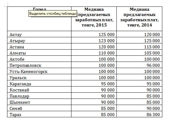 Что касается предлагаемых зарплат, то они стали выше в среднем на 3-5 процентов, считает эксперт. "Сейчас среднестатистический работодатель в Алматы в вакансиях в среднем готов предложить соискателю зарплату в размере 110 тысяч тенге, что на 4,8 процента выше прошлогоднего показателя, в Астане - 120 тысяч тенге (выше, чем в 2014 году на 4,3 процента). Наивысший показатель предлагаемого среднего ежемесячного заработка отмечен в 2015 года в Актау - 125 тысяч тенге (выше, чем в 2014 году на 4,2 процента), и Атырау - 123 тысячи тенге (ниже, чем в 2014-м на 1,6 процента)", - пояснила Быченко.