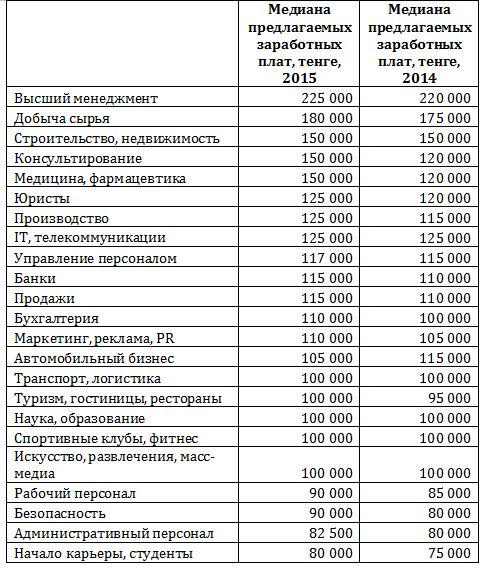 В целом, по ее словам, общая средняя предлагаемая работодателем зарплата в 2015 году: для соискателей из высшего менеджмента - 225 тысяч тенге, в сфере добычи сырья - 180 тысяч тенге, в отраслях строительство/недвижимость, консультирование и медицина/фармацевтика - по 150 тысяч тенге.