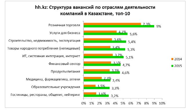 Кроме того, Быченко поделилась мнением о том, что лидерами по количеству опубликованных вакансий в 2015 году стали компании из розничной сферы, организации, оказывающие услуги для бизнеса, а также занимающиеся строительством и недвижимостью. А вот, к примеру, компании, которые оказывают финансовые услуги, переместились с пятого на шестое место, организации в сфере ИТ - с третьего на пятое место.