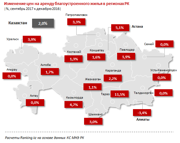 Снижение стоимости аренды благоустроенного жилья за девятимесячный период прошедшего года было зафиксировано только в Алматы, сообщает Ranking.kz. Цены в городе в сентябре 2017 года упали по сравнению с декабрем 2016-го на 3,4 процента. В свою очередь, в прошлом году за аналогичный период времени плата за жилье упала в пяти регионах.
