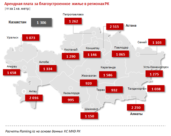Тройка самых дорогих регионов РК по уровню арендных плат за благоустроенное жилье не меняется - это Астана, где за один квадратный метр платят по 2,5 тысячи тенге, Алматы с ценами в 2,3 тысячи за один квадрат и Актау (2 тысячи тенге).