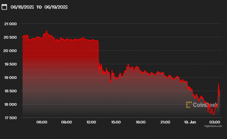Цена биткоина упала ниже 19 тысяч долларов © Twitter/FinClub