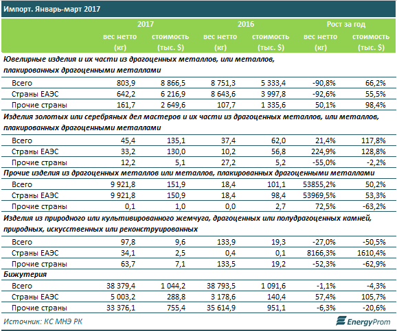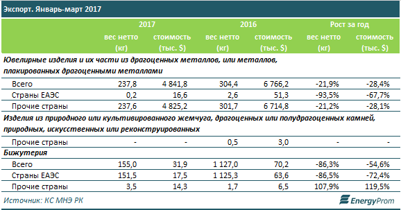 Экспорт Казахстаном ювелирных изделий по итогам первого квартала также сократился - минус 21,9 процента в натуральном выражении и минус 28,4 процента в стоимостном, как и экспорт бижутерии - минус 86,2 процента в килограммах и минус 54,6 процента в деньгах.