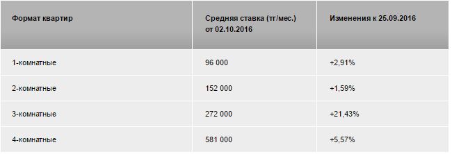 По данным специалистов, на неделе с 26 сентября по 2 октября средняя цена аренды квадратного метра составила 2 557 тенге за квадратный метр. Аренда за семь дней выросла на 19,83 процента. Снять квартиру в Астане предлагают в среднем за 226 тысяч тенге.