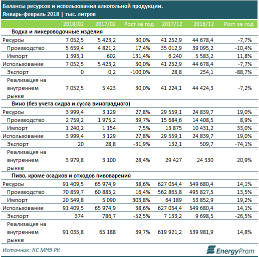 Начало года ознаменовалось взлетом спроса на алкоголь у казахстанцев: по итогам первых двух месяцев (январь-февраль 2018), реализация водки и ликероводочных изделий на внутреннем рынке страны выросла сразу на 30 процентов, вина - на 28,4 процента, пива - на 39,7 процента.