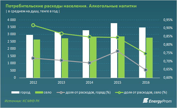 Расхождения в статданных также указывают на немалые объемы "левой" продукции на рынке. К примеру, по официальной статистике в 2016 году каждый казахстанец в среднем потратил на алкоголь за год всего 3175 тысячи тенге (или по 3476 тенге на душу населения в городской местности, и по 2772 тенге - в сельской) - это всего 0,7 процента от общего объема расходов одного среднестатистического казахстанца.