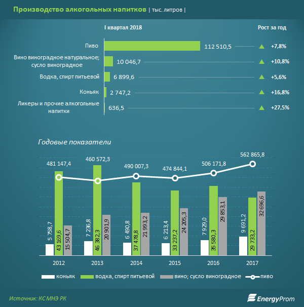 Рост наблюдается и в сегменте менее крепких напитков. Изготовление вин увеличилось на 10,8 процента, до 10 миллионов литров за январь-март 2018, пива - на 7,8 процента, до 112,5 миллиона литров.