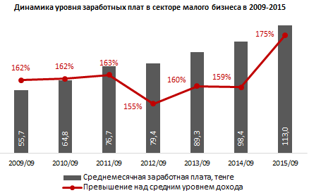 Кроме того, сообщается, что за год условия труда в секторе малого бизнеса несколько улучшились (не учитывая влияние инфляции).  В результате чего оплата труда достигла исторического максимума - на конец третьего квартала 2015 года среднемесячная заработная плата работников составила 113 тысяч тенге, что на 15 процентов выше, чем годом ранее, а также выше уровня роста среднедушевых денежных доходов в РК (+5 процентов за год).