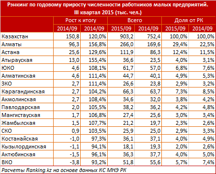 "Под давлением усиления кризисных явлений в экономике численность работников на крупных и средних предприятиях достигла минимального уровня за последние 5 лет в 2,7 миллиона человек по состоянию на конец третьего квартала 2015 года, сократившись за год на 18 процентов. При этом число рабочих мест на малых предприятиях показало рост за год на 20 процентов, приблизившись к рекордным уровням, достигнутым в 2010 году, - отметили аналитики.  - На этом фоне объем трудовых ресурсов, задействованных в малом бизнесе РК, увеличился до 33 процентов от численности работников крупных и средних предприятий".