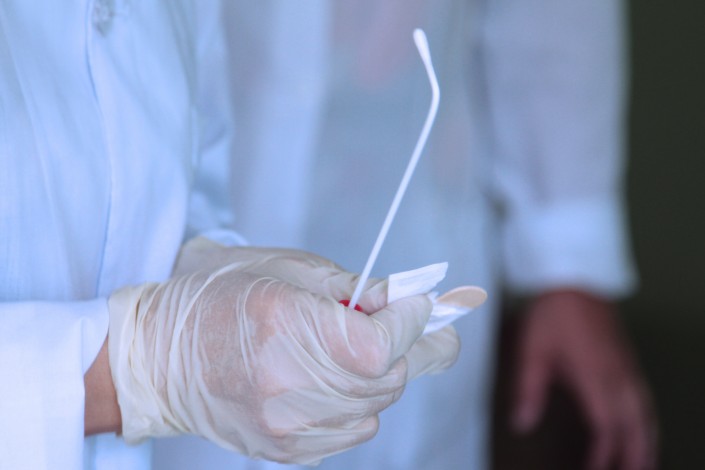 Само обследование происходит следующим образом. Сначала у человека, который пришел на обследование, берут пробу биологического материала. Поскольку "входными воротами" инфекции являются слизистые оболочки верхних дыхательных путей, материал на исследование берется мазком с носоглотки с помощью специального стерильного тампона.