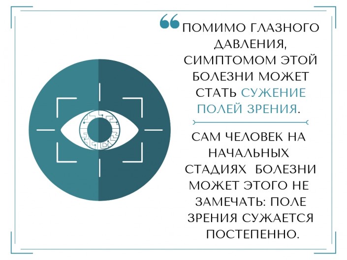 Помимо глазного давления, симптомом этой болезни может стать сужение полей зрения. Сам человек на начальных стадиях болезни может этого не замечать: поле зрения сужается постепенно. В конечном итоге пациент начинает видеть, будто смотрит в трубочку. Мы называем такой симптом трубчатым зрением, который может привести к разным трудностям в обычной жизни. Если такой пациент водит автомобиль, то он часто может попадать в аварии, так как не видит происходящее справа и слева, при ходьбе он может спотыкаться.