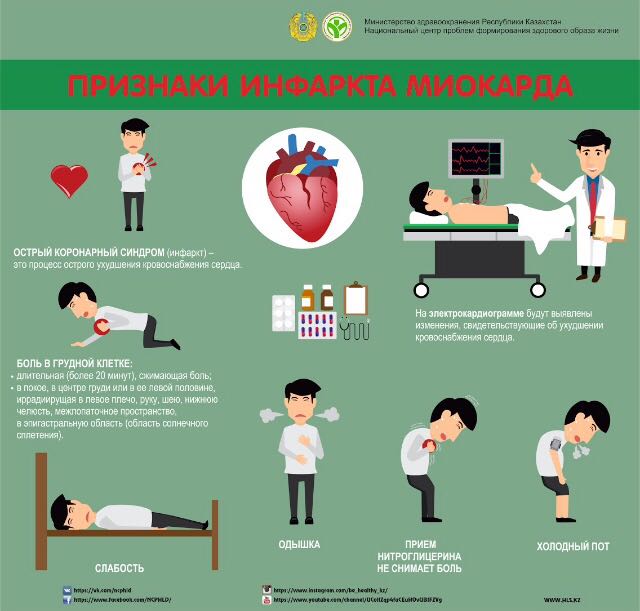 Наиболее частой причиной смерти является инфаркт миокарда. Запомните симптомы инфаркта: это длительная (более 20 минут) сжимающая боль в центре груди или в ее левой половине, распространяющаяся в левое плечо, руку, шею, нижнюю челюсть, межлопаточное пространство, область солнечного сплетения. Необходимо прекратить физическую нагрузку, лечь в постель, успокоиться, принять аспирин (160-325 миллиграммов), разжевать и проглотить, положить под язык нитроглицерин и срочно вызвать бригаду скорой медицинской помощи, набрав 103.