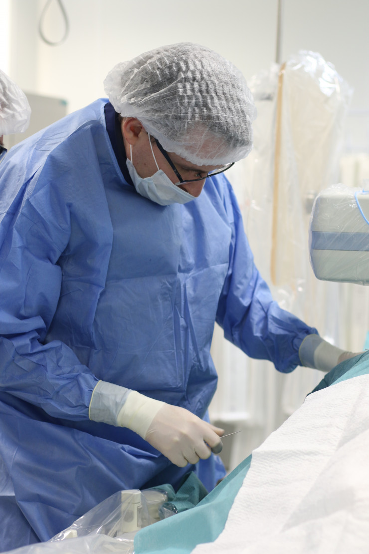 В этом мастер-классе в Президентской клинике он делится опытом проведения малоинвазивных операций на коленном суставе не с ортопедами-травматологами, а с интервенционными хирургами. Все дело в том, что у некоторых пациентов в результате остеоартроза на месте поражения хрящевой ткани образуются новые кровеносные сосуды и, как следствие, усиливается кровоток.