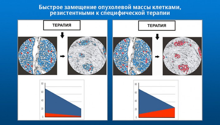 Получается, что в опухоли сосуществуют два типа клеток: одни не имеют устойчивости к лечению, но поначалу выигрывают в скорости роста и поэтому по большей части формируют опухолевую массу. Другие изначально обладают резистентностью, то есть устойчивостью против будущего препарата. В данном случае речь идет не о механизмах эволюции, что было бы понятно… Речь идет о селекции предсуществующих клеток.