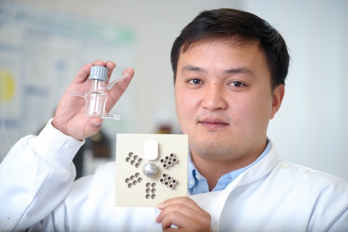 Габит Нурумбетов держит в правой руке изобретенную им диффузионную ячейку. В левой руке - классическая ячейка Франца. Фото с сайта Уорикского университета