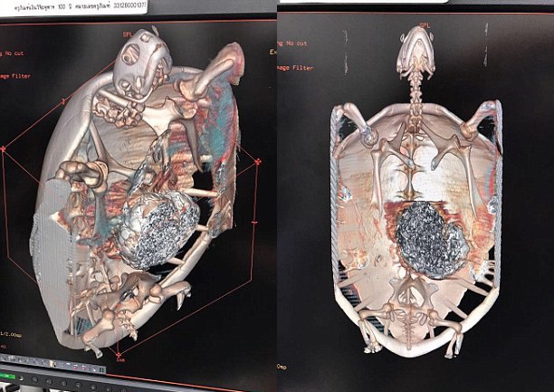 Как показало 3D-сканирование, в желудке 60-килограммовой рептилии, имя которой означает "банк" или "копилка", находилось огромное металлическое образование. Разрезав брюхо черепахи, медики извлекли оттуда 915 монет весом почти в 5 килограммов и два рыболовных крючка. Процедура заняла около 7 часов.