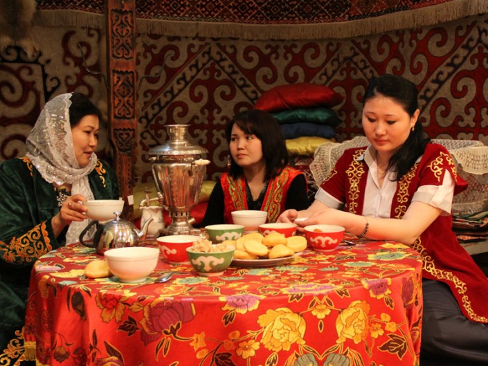 9. Когда сытые и довольные гости, наконец, расходятся, то от хозяйки дома можно услышать привычное: "Ал енді өзіміз шәй ішейік" (а теперь сами попьем чай). Тогда к старшим присоединяются все келинки и начинается чаепитие в кругу своих.