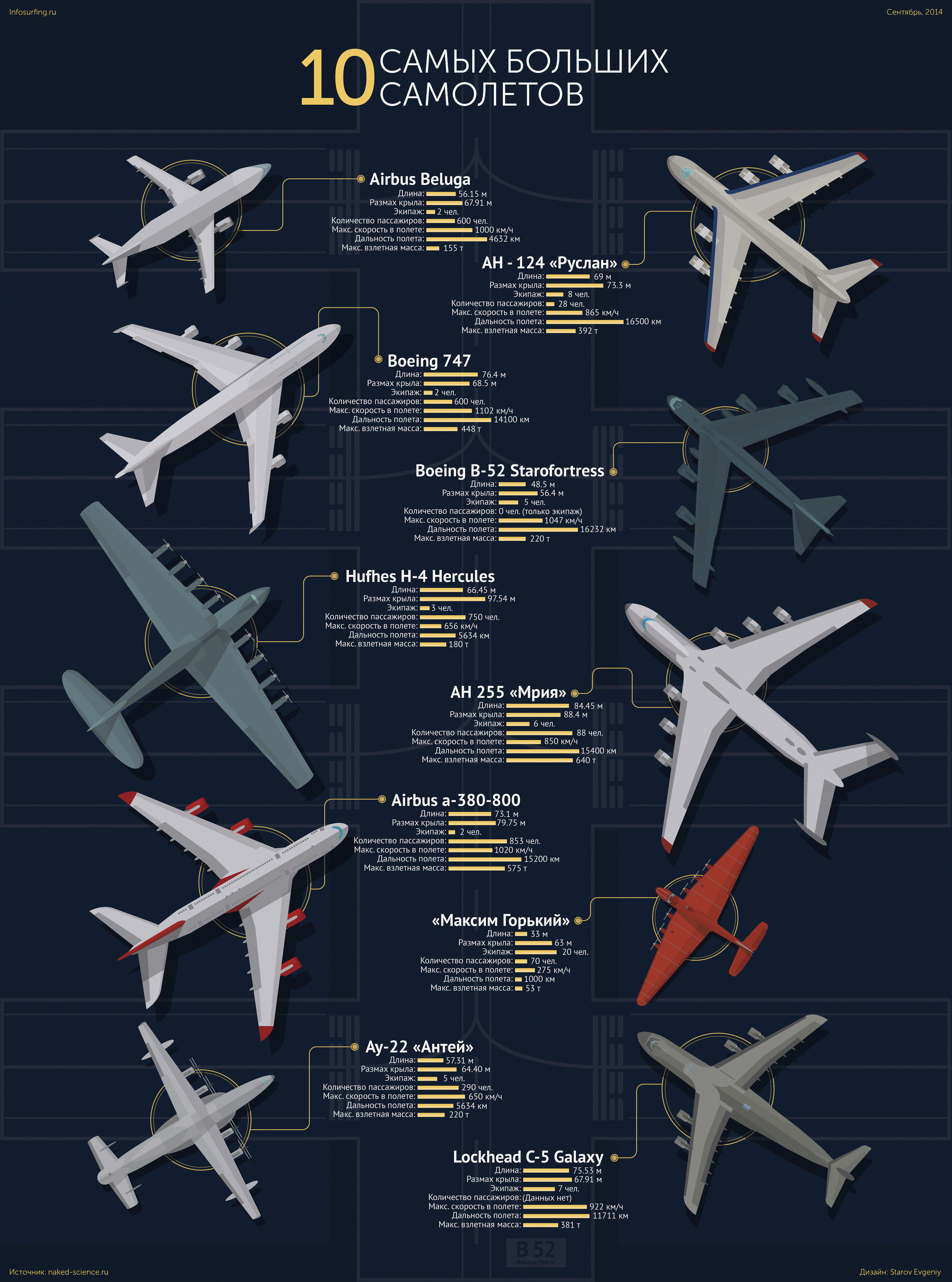 Авиации, как и многим сферам инженерной мысли, гигантизм не чужд. Издание Naked Science подобрало ряд самых крупных и впечатляющих самолетов, когда-либо поднимавшихся в воздух. Рассматривались не только сухие габариты, но и значение для мировой авиации, а также оригинальность конструкции и назначения.