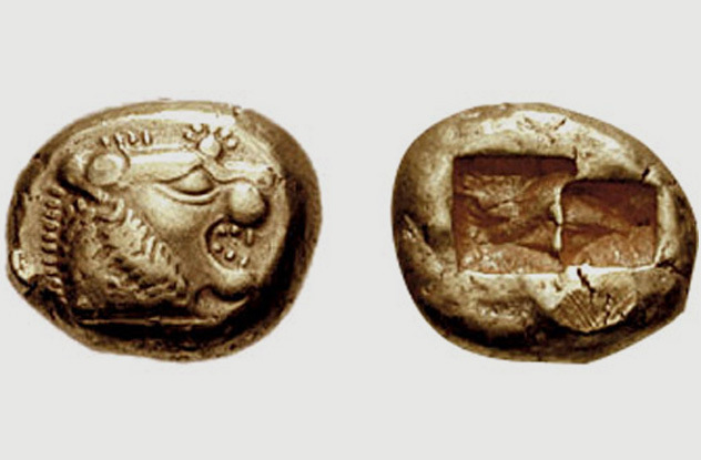 До того как монеты начали выпускать государства, ранние монетовидные знаки чеканились богатыми купцами и влиятельными членами общества. Большинство экспертов сходятся во мнении, что первая в мире монета - это треть статера, отчеканенная лидийским царем Алиаттом между 660 и 600 годами до нашей эры. На одной стороне монеты изображена голова рычащего льва, а на другой стороне - вдавленный двойной квадрат. Монета изготовлялась из электрума, сплава серебра с золотом.